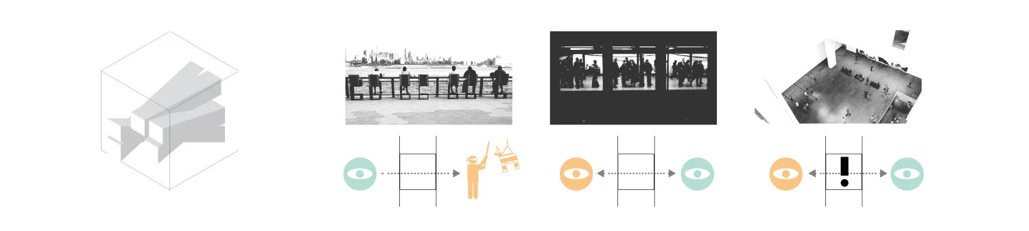 Like viewers across a platform, the voids make the separated participants unacknowledged voyeurs. Unable to establish a one to one relationship, the viewer instead is given a sense of the system.