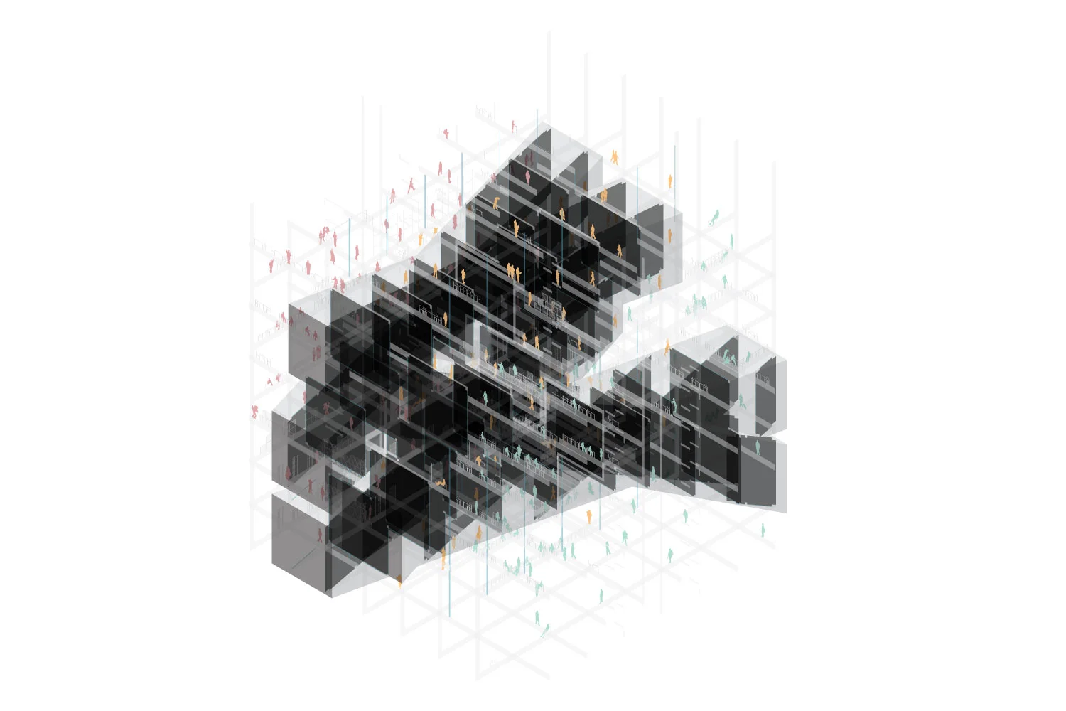 Re-imagining the relationship between public, production and offices. These three programs independently function while firmly pressed against each other. The public is thrust in-between these two traditionally private corporate worlds. Negotiating for them is a series of rectilinear voids. The public visitor becomes a voyeur into this secret world. Direct interaction is only allowed when the voids pierce through the threshold. The public observer is watching, yet never fully understanding the complexity of its use.