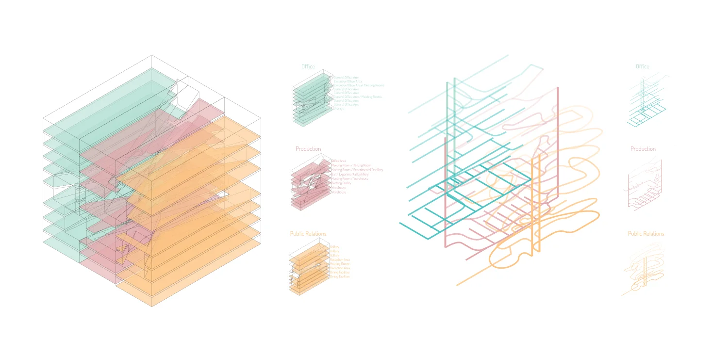 The office slice features open plans that reorganize as needed. The visitor slice ducks and weaves between two controlled programs. The production slice narrates as one moves up the building